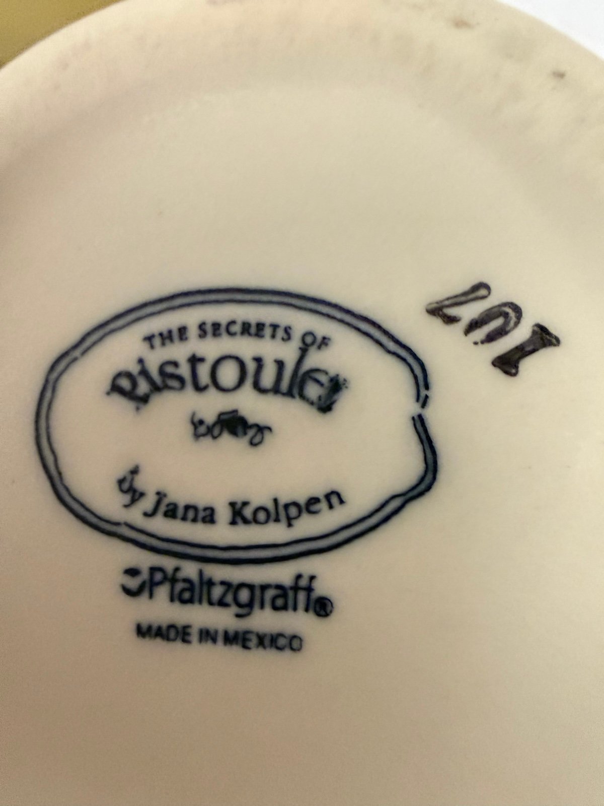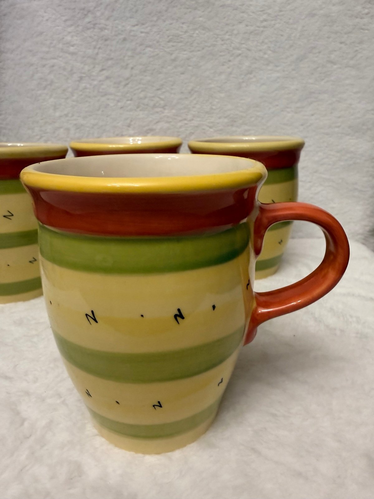 Charming striped mugs by Pfaltzgraff. Features green, yellow, and red hues. The design Oz part of "The Secrets of Pistoulet" collection by Jana Kolpen, features a striped Tuscan look.